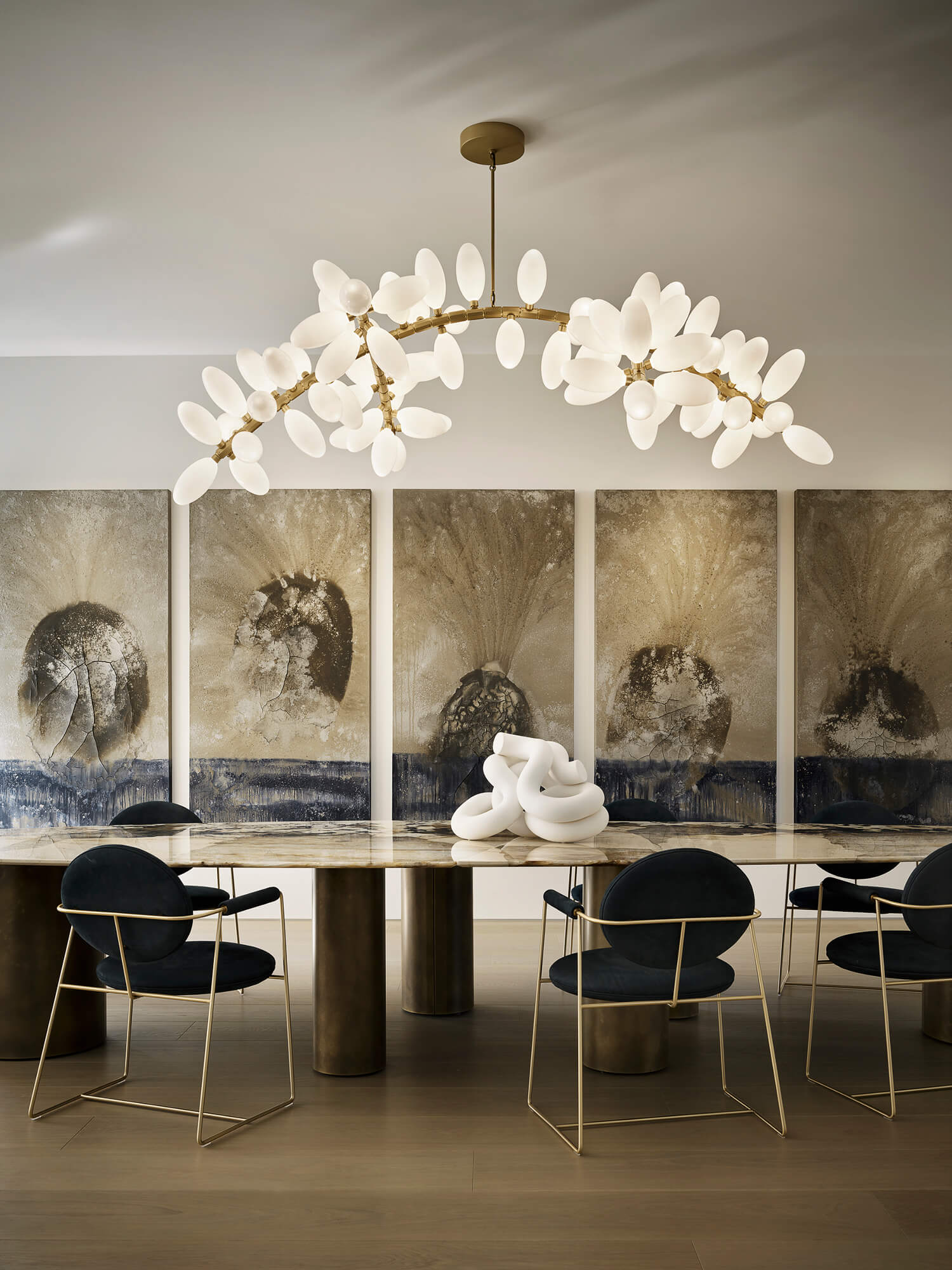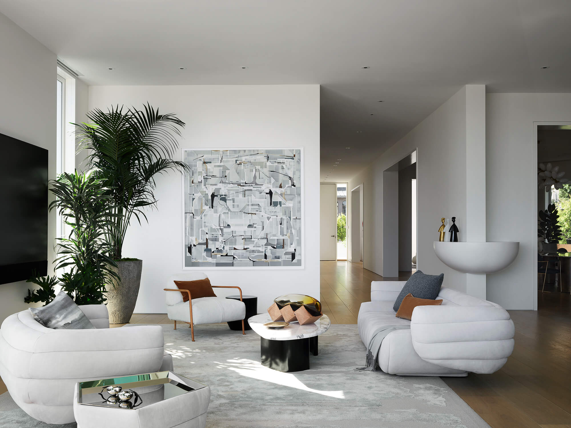 The interiors provide moments of whimsy and joy by strategically inserting sculptural pieces into an otherwise subdued backdrop. Aligned with their ethos of minimalism and restraint, the team adhered to a limited palette of European wide-plank white oak, concrete, steel, and white solid surface material.