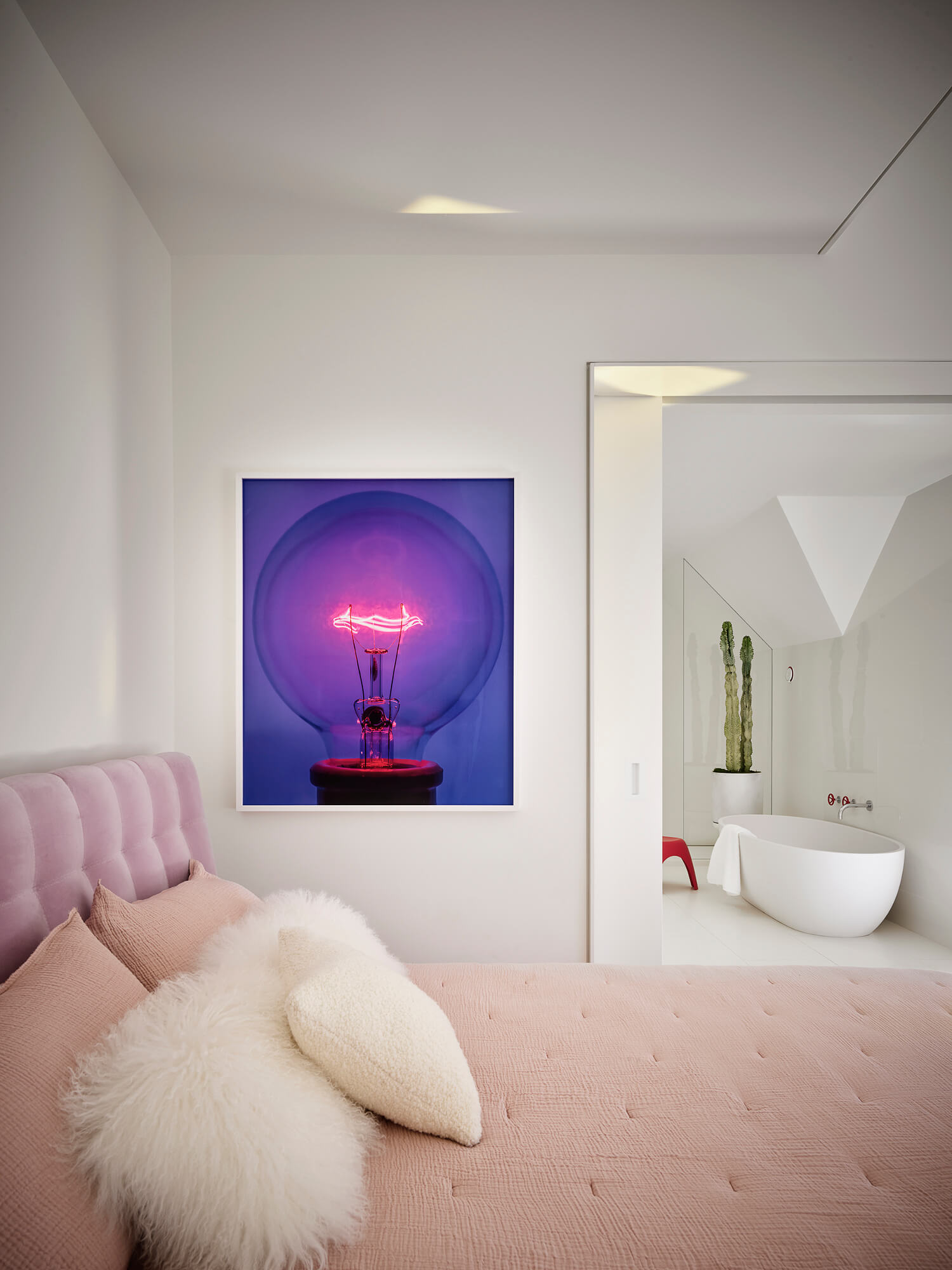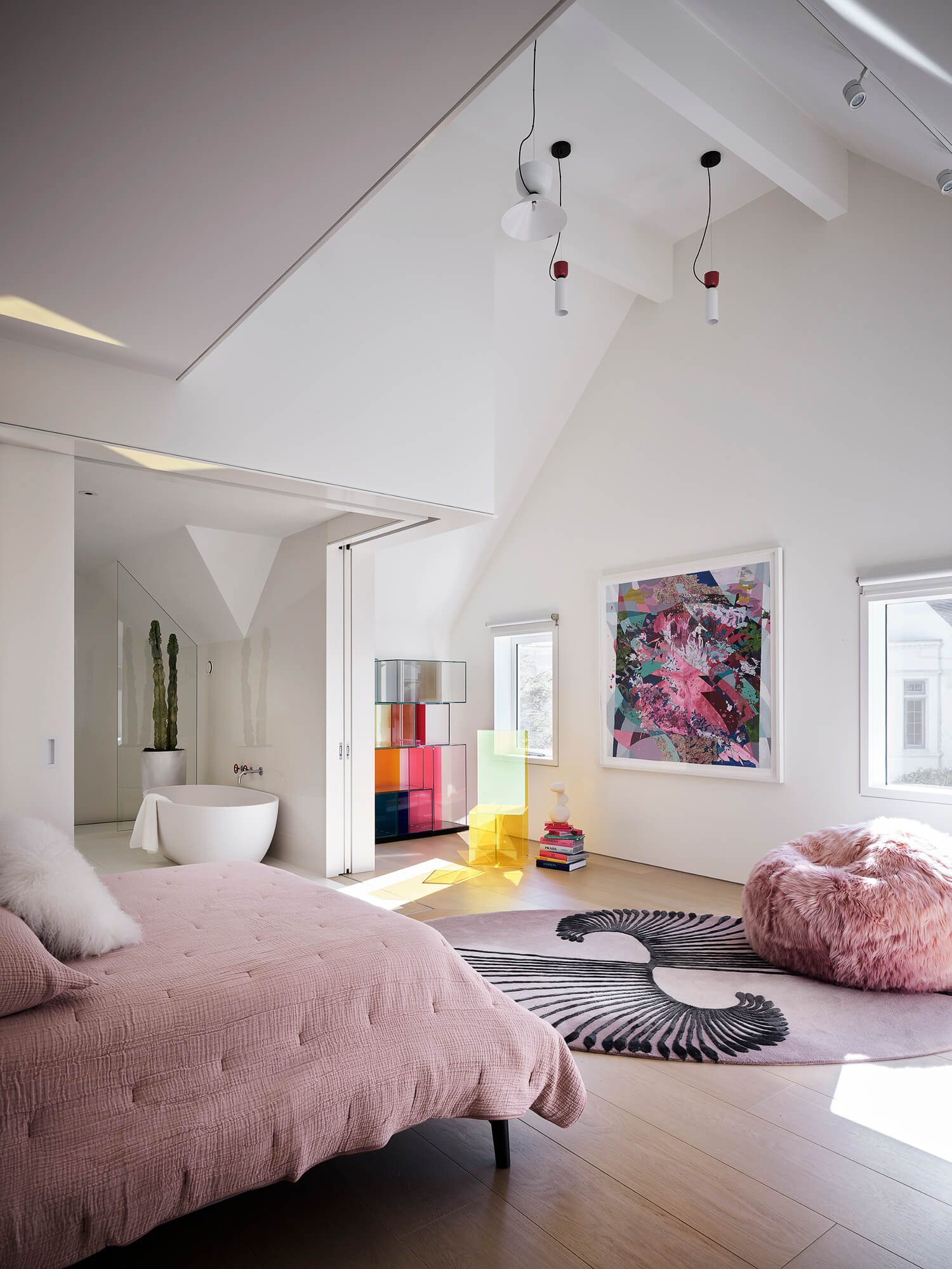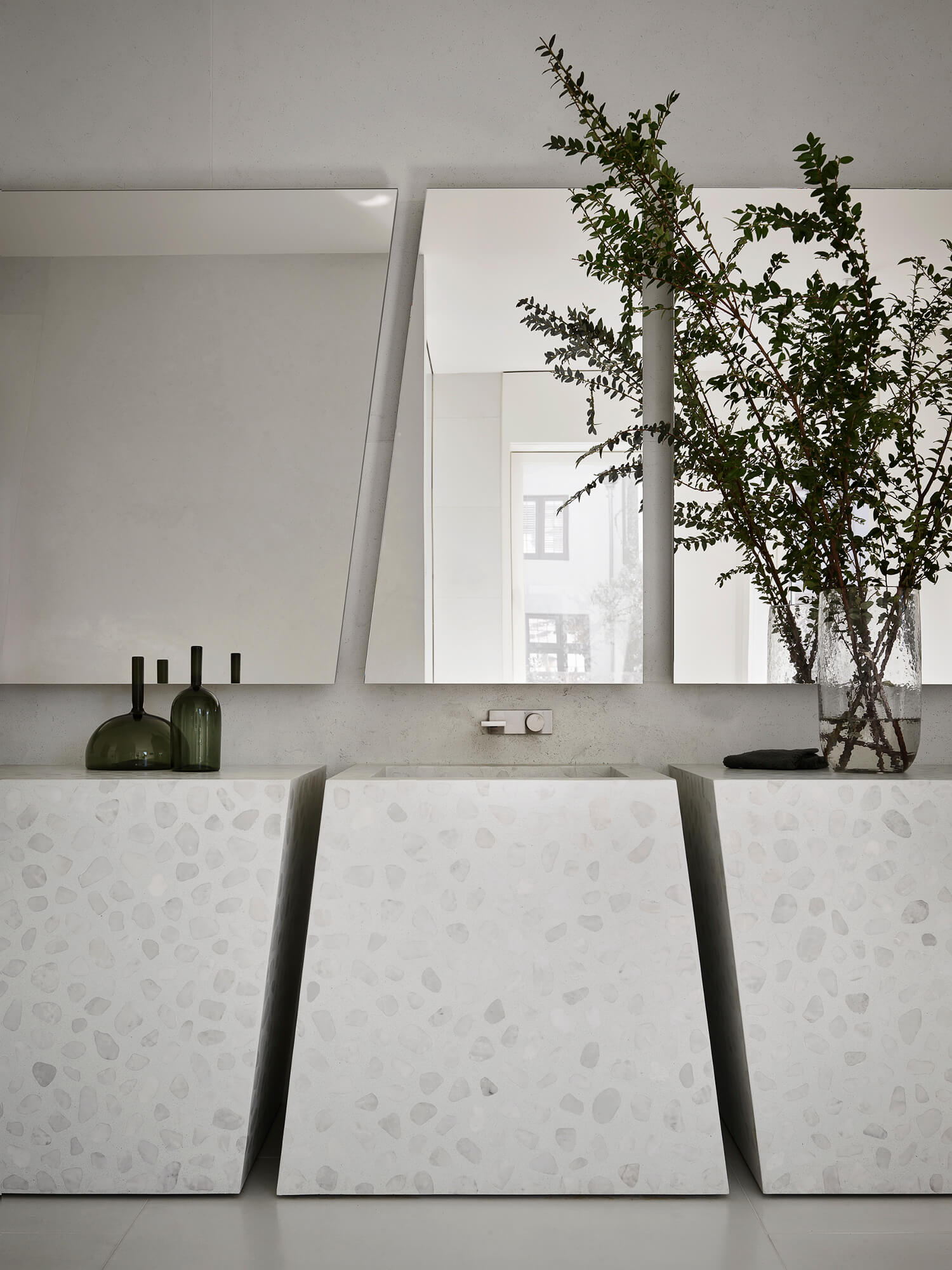 In the primary bathroom, an arrangement of angular terrazzo monoliths masquerade as a double vanity.